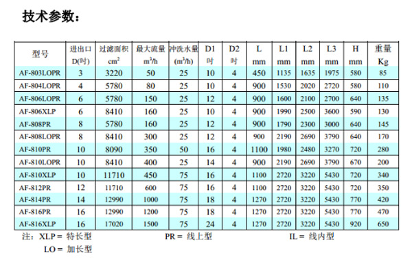 处理水量大:单台最大处理流量可以达到1700m/h过滤面积大,因而过滤效果好具有最广泛的应用最大限度地节约能源:水、电及人工最小工作压力:2bar(30psi)最大工作压力:10bar(150psi),16bar,25bar,40bar过滤器清洁时的压力损失:0.1bar(2psi)最高工作水温:65C(149F)过滤精度范围:10-3000微米自清洗所需水量(在最小工作压力时):80升...
